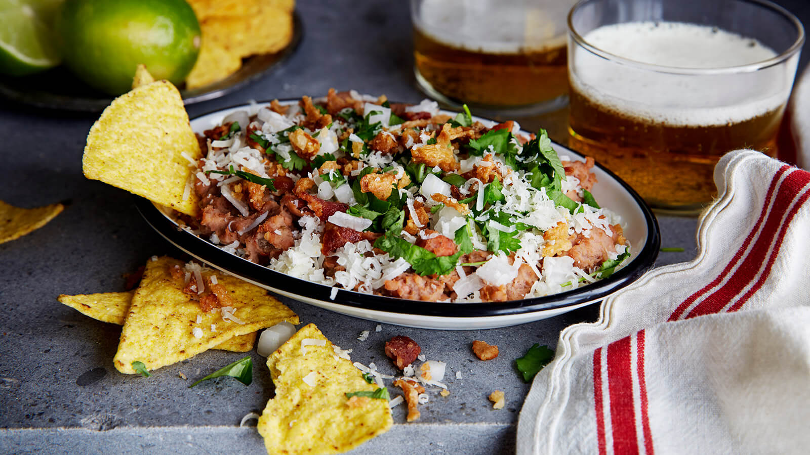 Refried beans med bacon, parmesan och rostad lök
