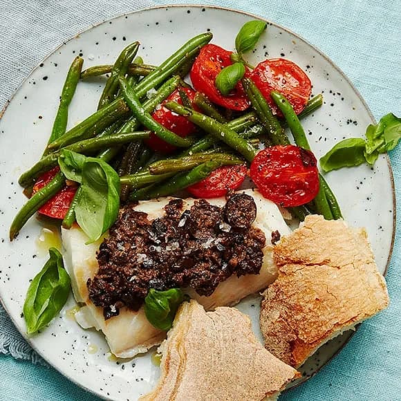 Tapenadetorsk med vitlöksfrästa gröna bönor