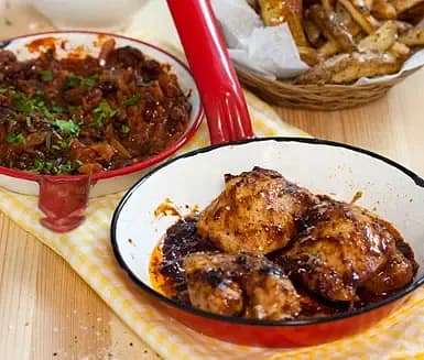 Barbequekyckling med potatisstavar och hot beans