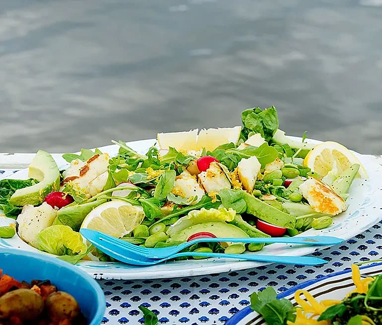 Honungsstekt halloumi och citronslungade bönor