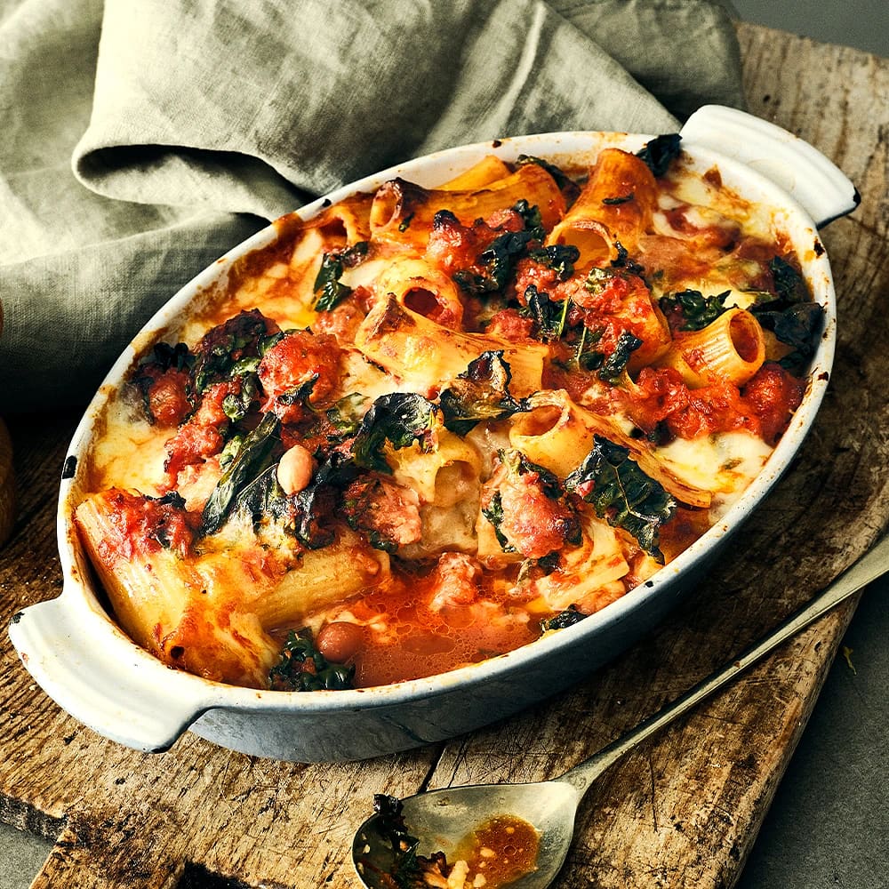 Baked beans med rigatoni och fior di latte