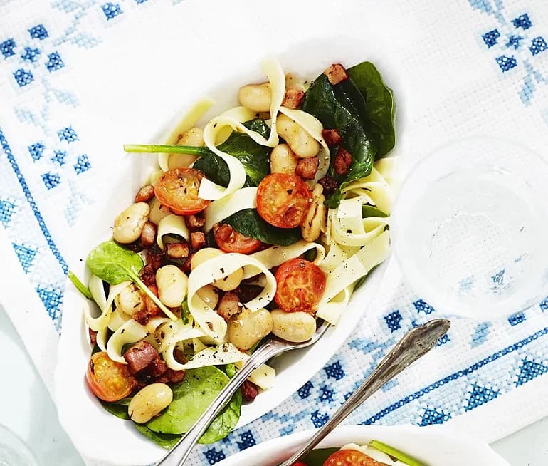 Spaghetti med bacon och bönor