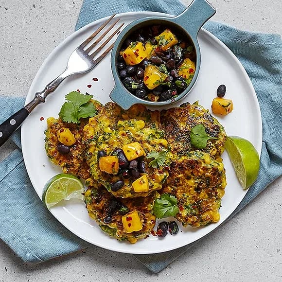 Majsfritters med mango- och bönsalsa