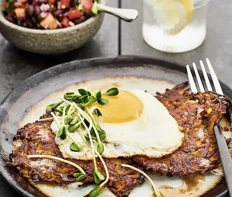 Sötpotatisrösti med bönsalsa och stekt ägg
