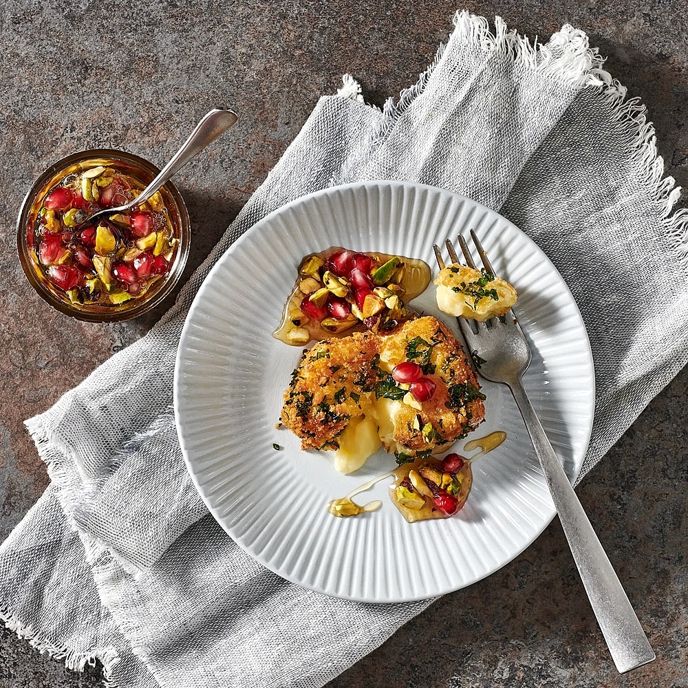 Persiljefriterad brie med granatäpple och pistagehonung