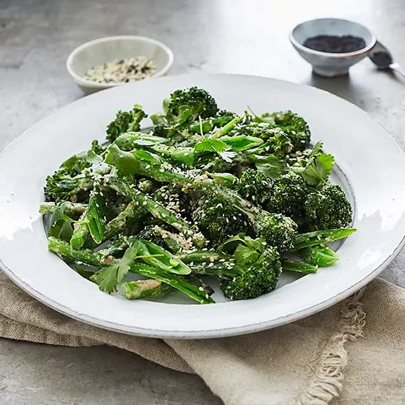 Sojafräst broccolisallad med rödkål, bulgur och sesamkyckling