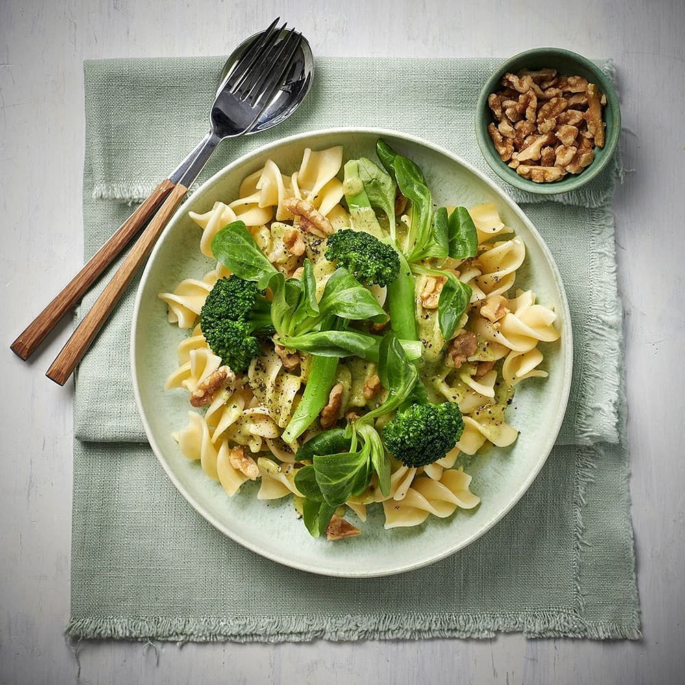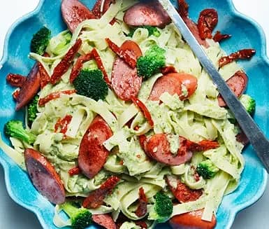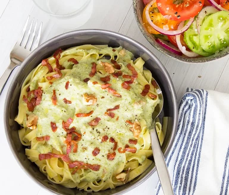 Pasta med mixad broccolisås och knaperstekta baconstrimlor