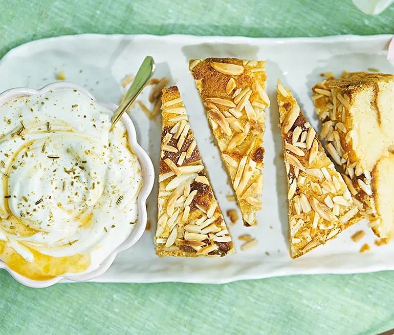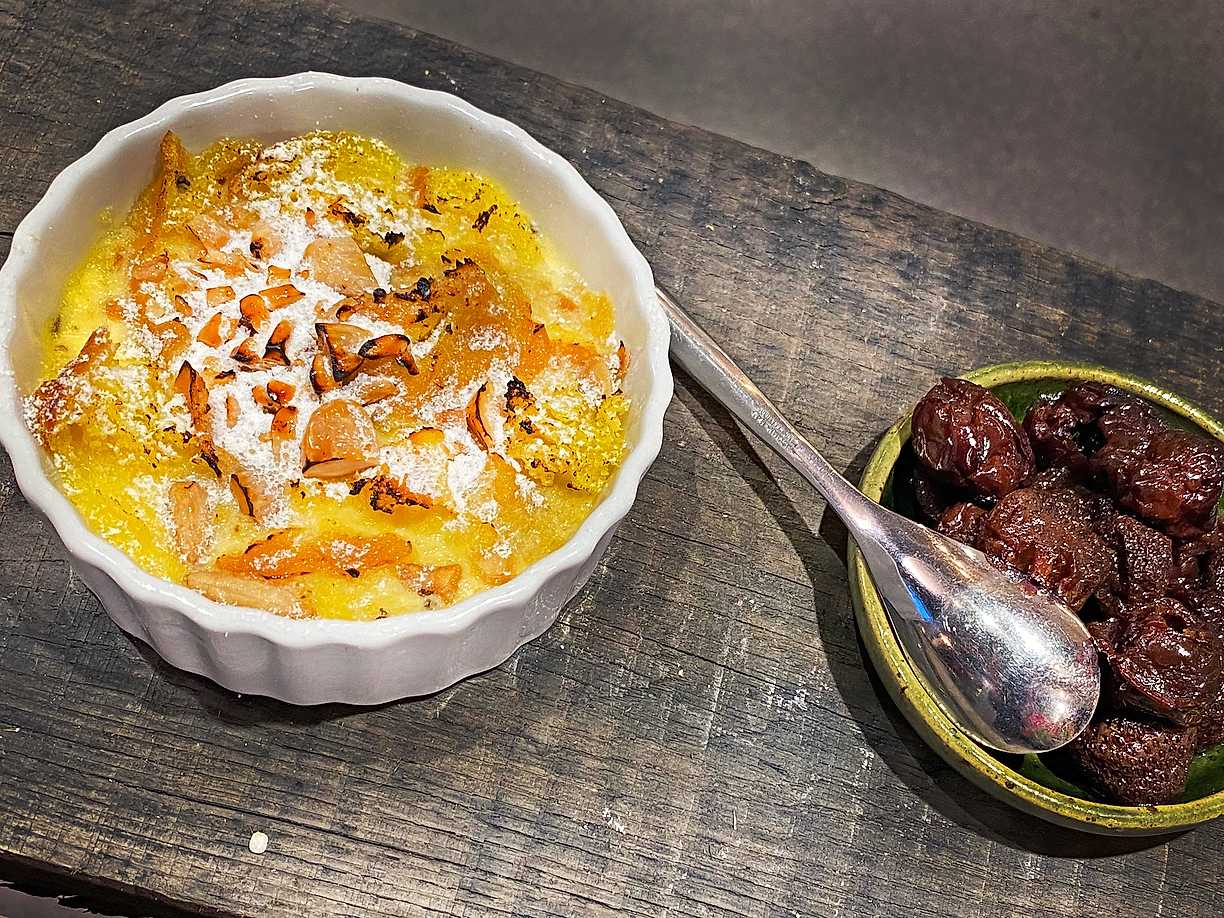 Brödpudding med mandel och aprikosgrädde