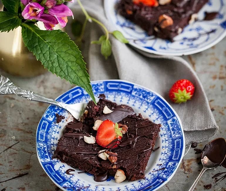 Glutenfri blackbean brownie med fudgeglasyr och bär