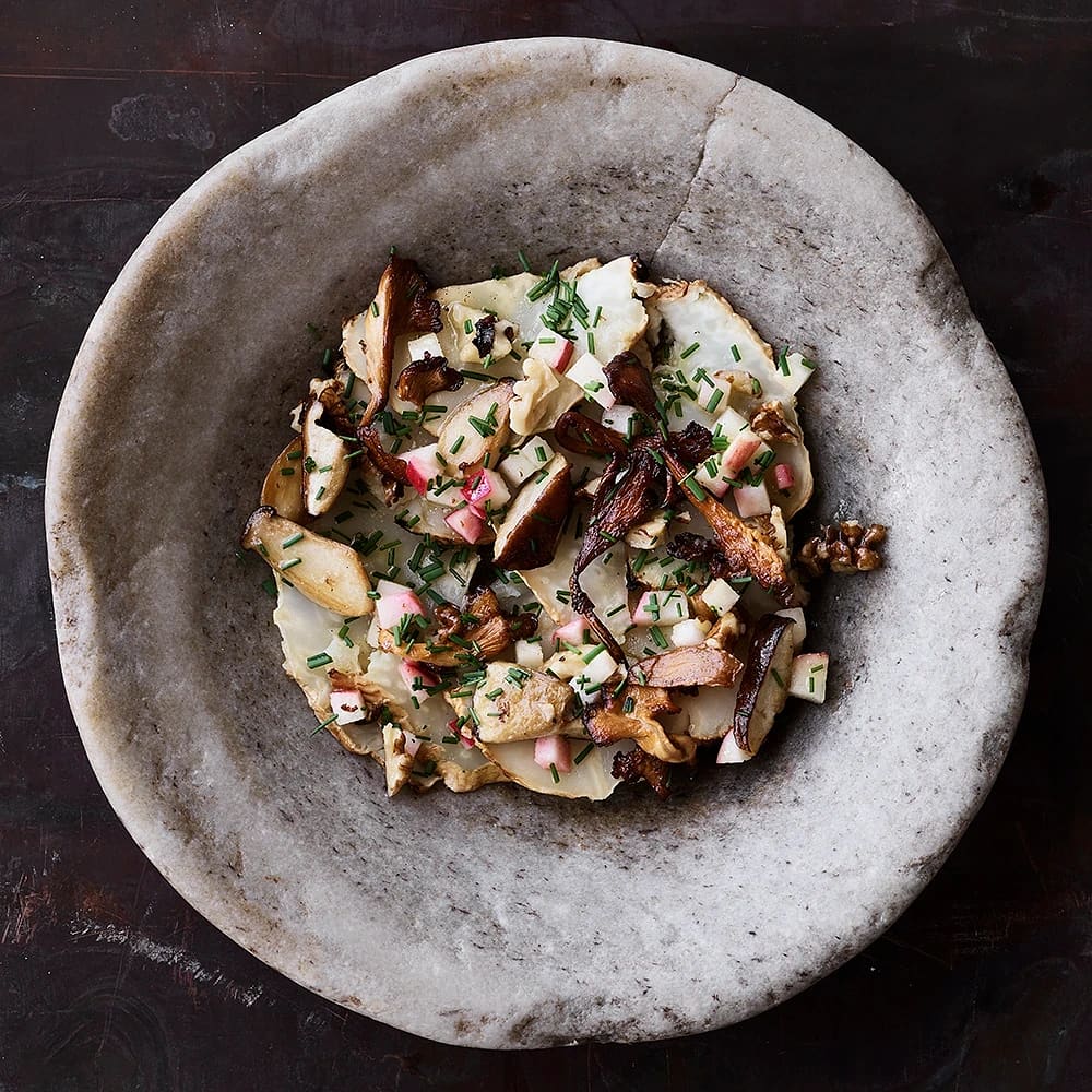 Potatiskräm med Västerbottensost toppad med jordärtskocka och brynt smör