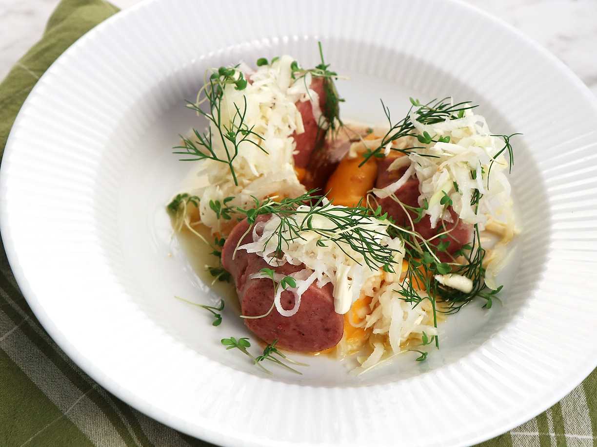 Fläskkorv med kålrotskräm på brynt smör