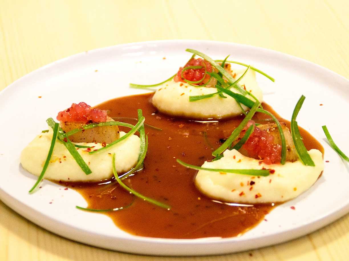 Stekta pilgrimsmusslor med tryfferad äggröra, pommes paille och rökt brynt smör