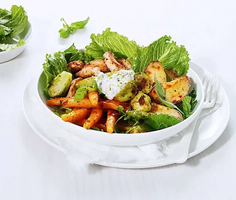 Ljummen sallad med tomatrostad brysselkål och basilika/limeyoghurt