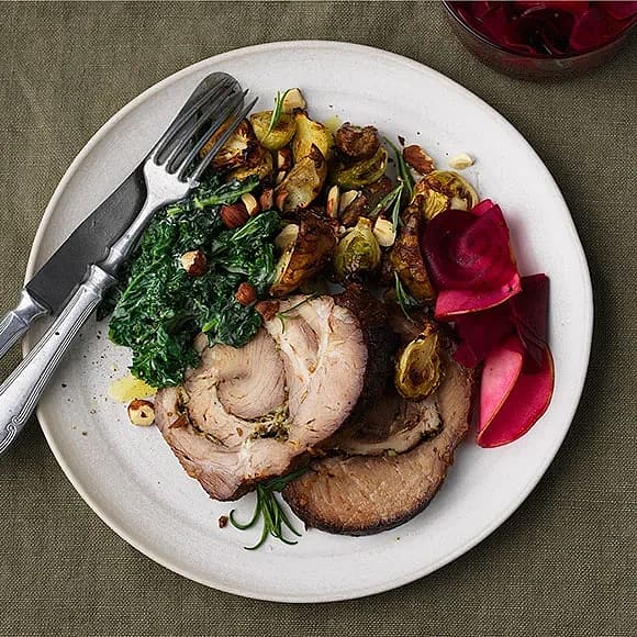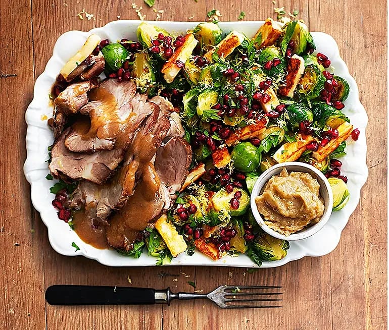 Jultallrik med äppelkarré, brysselkål och halloumi