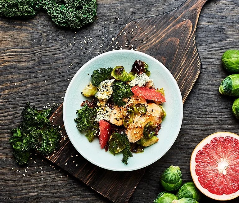 Rostad brysselkål med sojakyckling, sesamdressing och grönkålschips