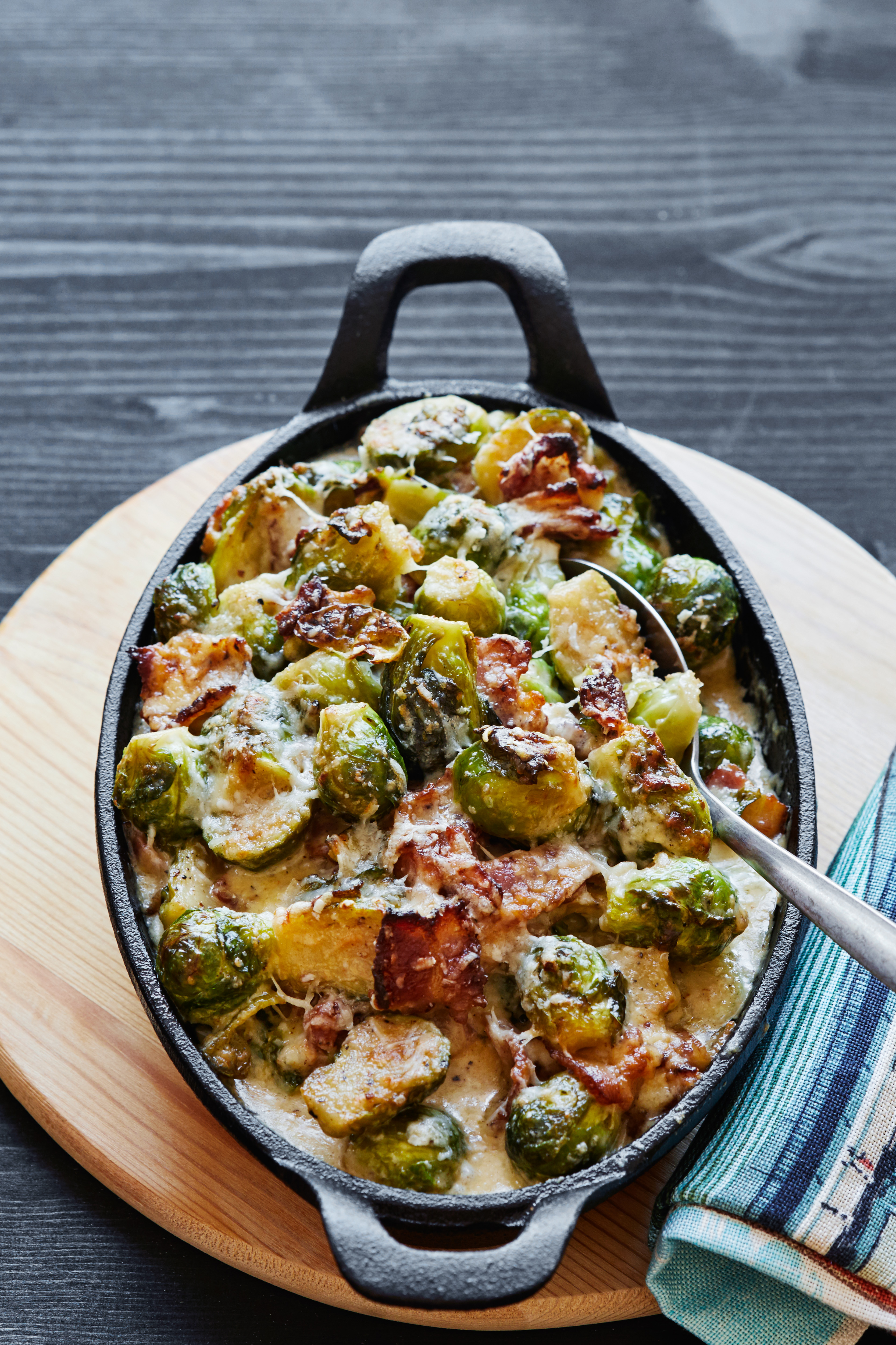 Krämig brysselkål med gnocchi och stekt sidfläsk