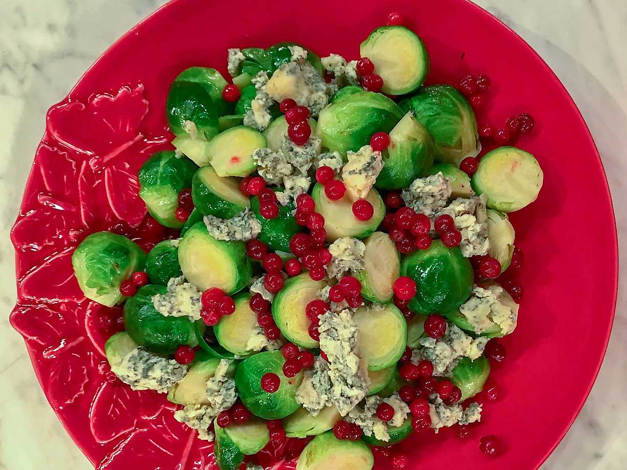 Rostad brysselkål med marinerad lök, granatäpple och fetaost