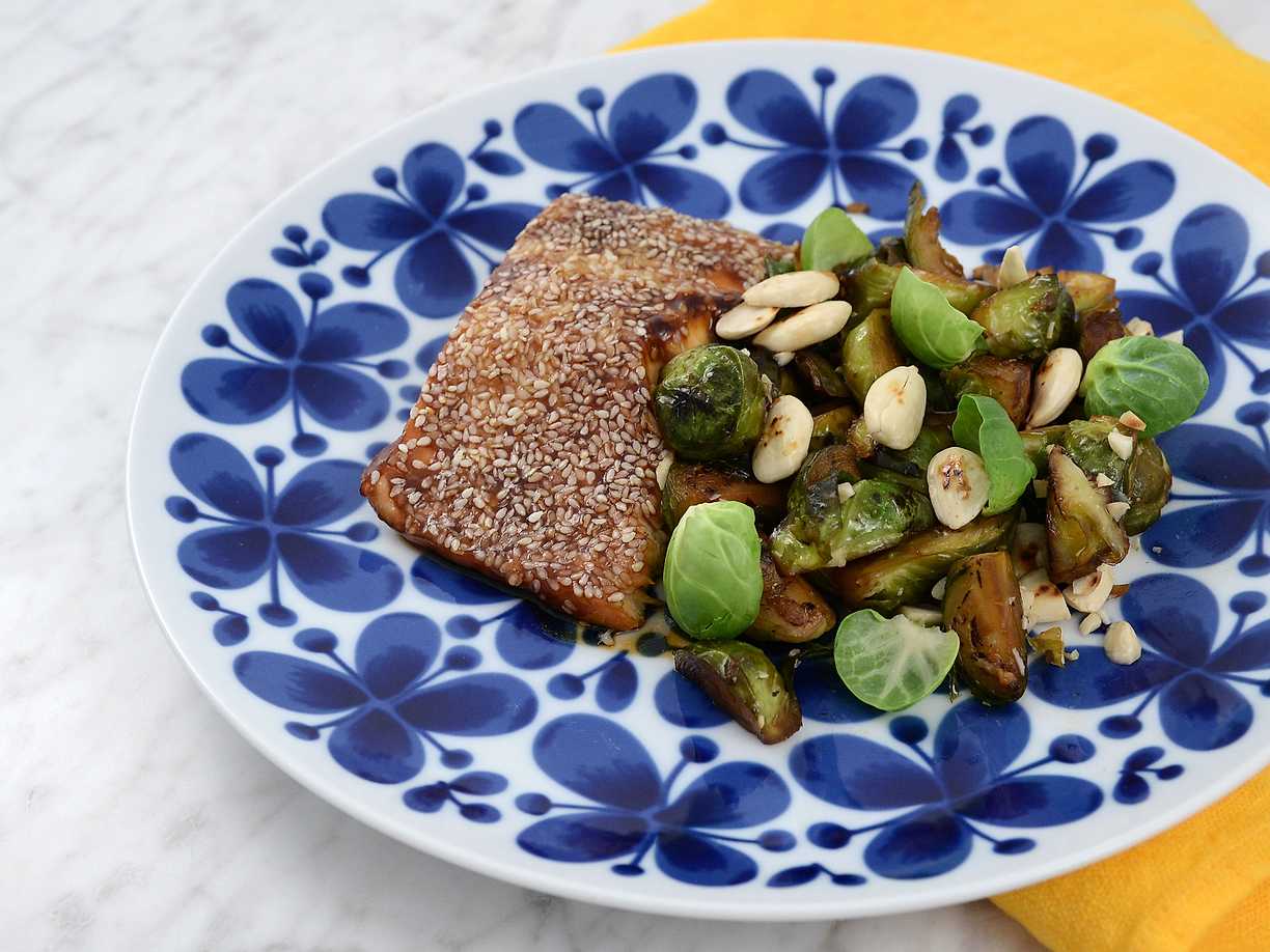 Teriyakilax med sesam och brynt syrlig brysselkål