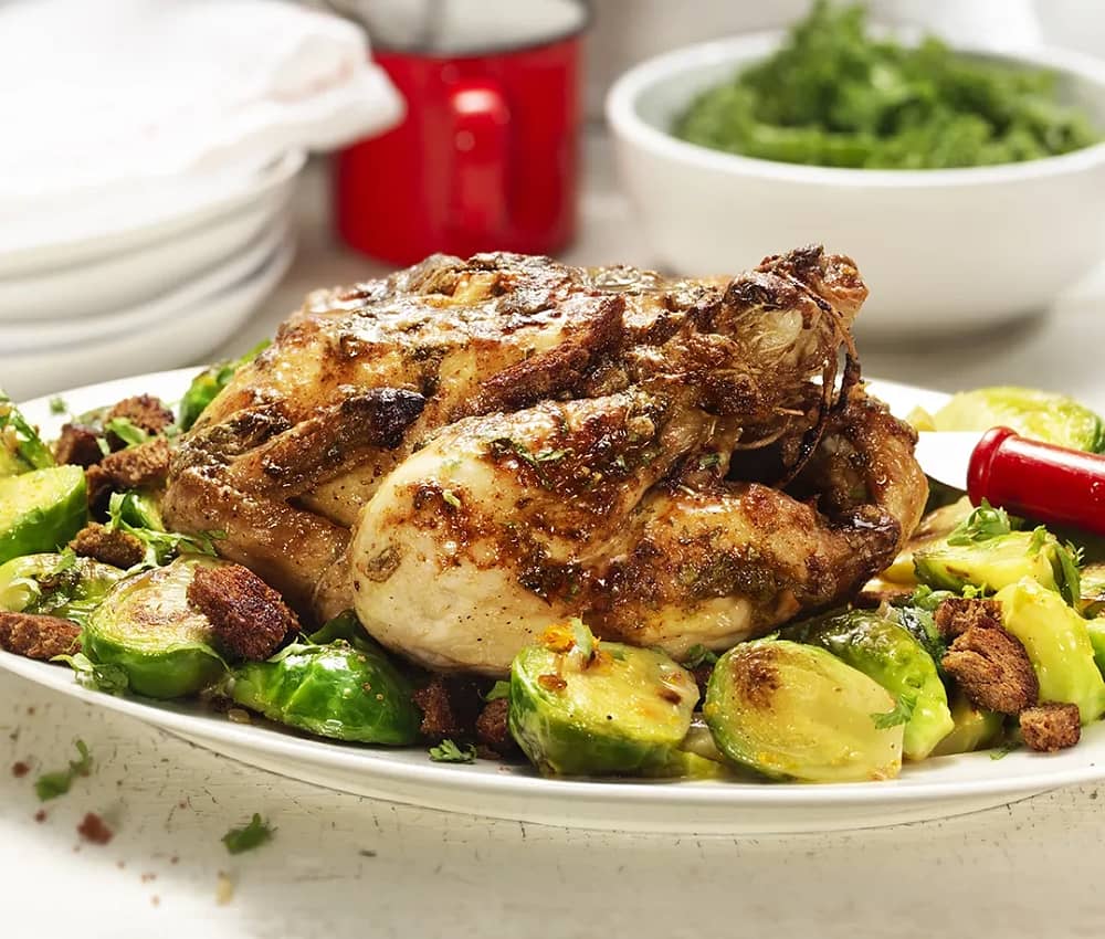 Senapsstekt gårdskyckling med brysselkål och vörtsmulor