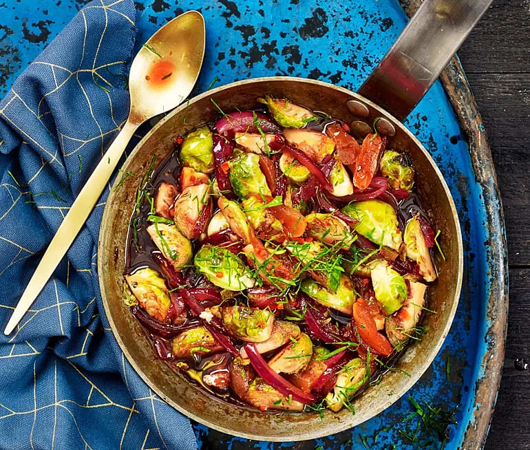Stekt brysselkål med curry, chili och aprikoser