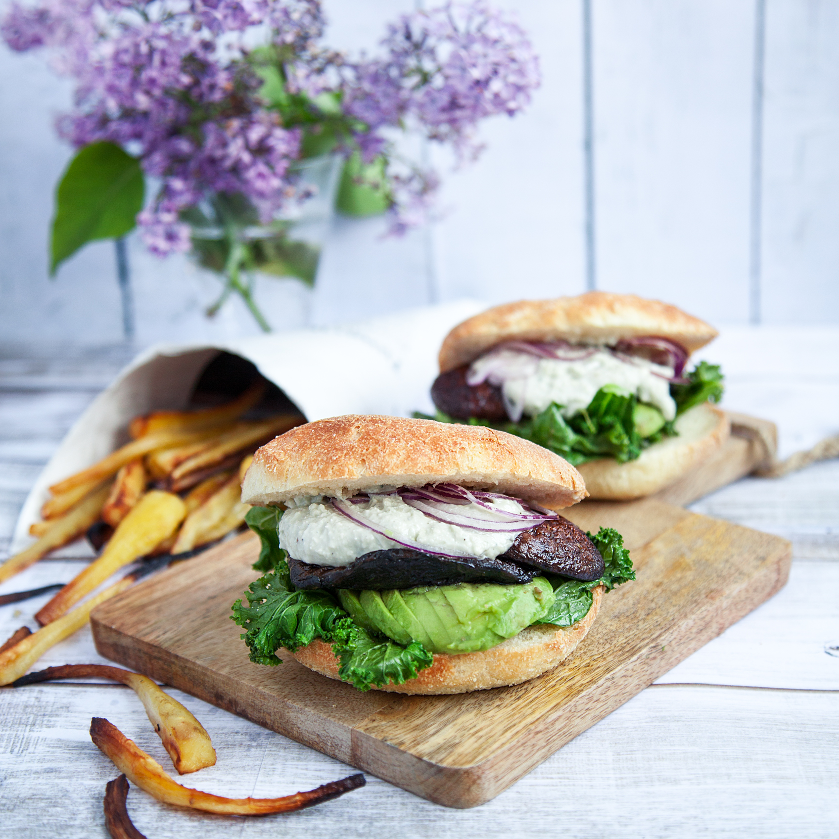 Portabelloburgare med ädelostdipp, avokado och palsternacksstrips