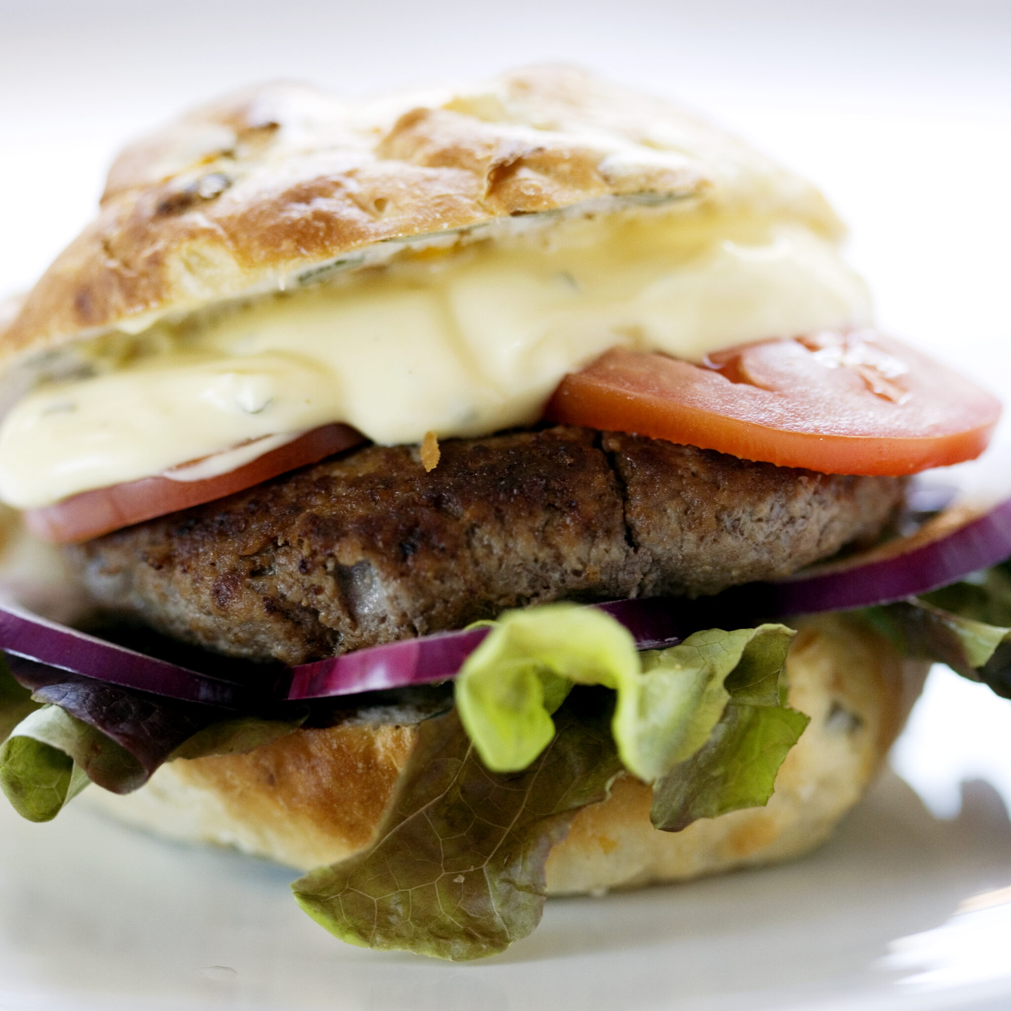 Hamburgare med cheddar, karamelliserad lök, ugnsbakad tomat och tryffelmajonnäs