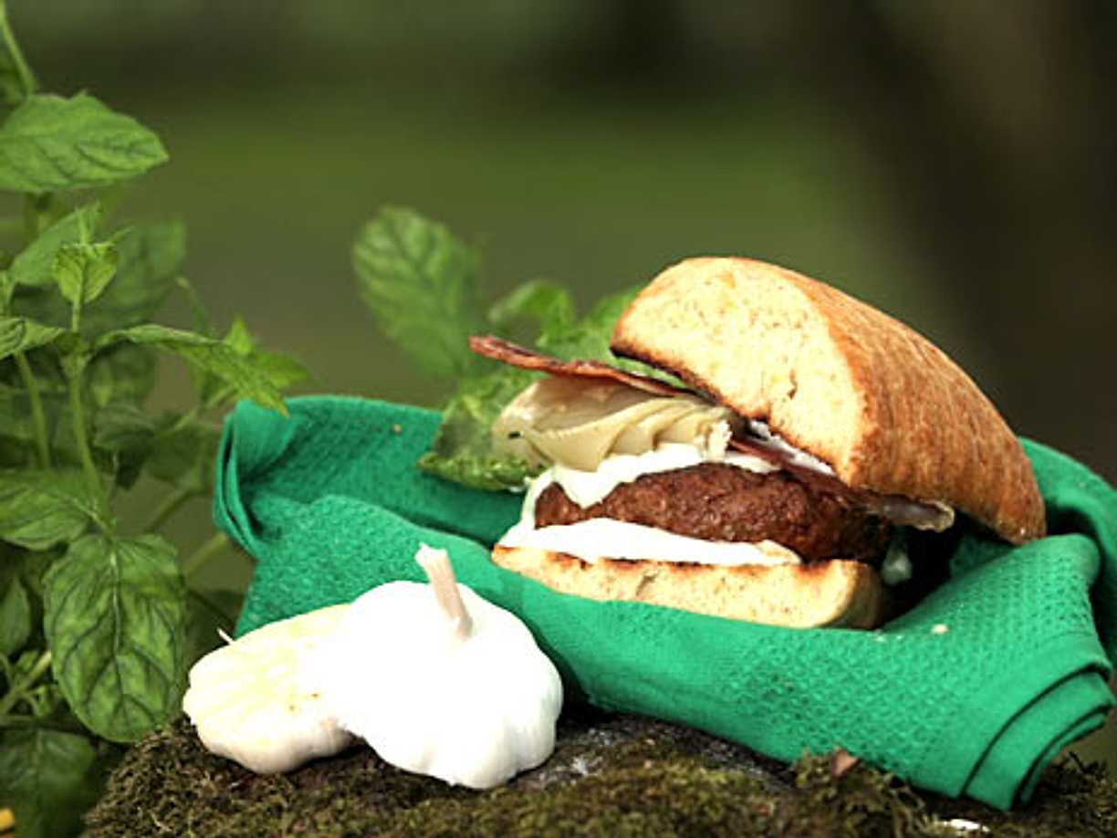 Högrevsburgare med karamelliserad svamp och tryffelmajonnäs