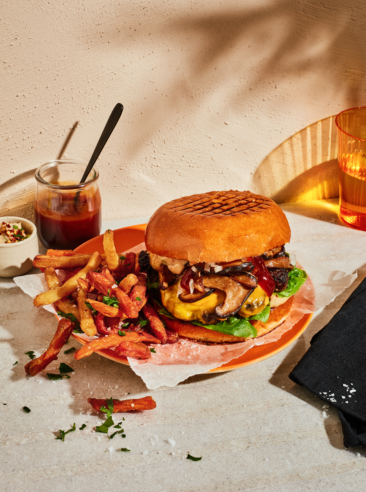 Champinjonburgare med sötpotatisaioli