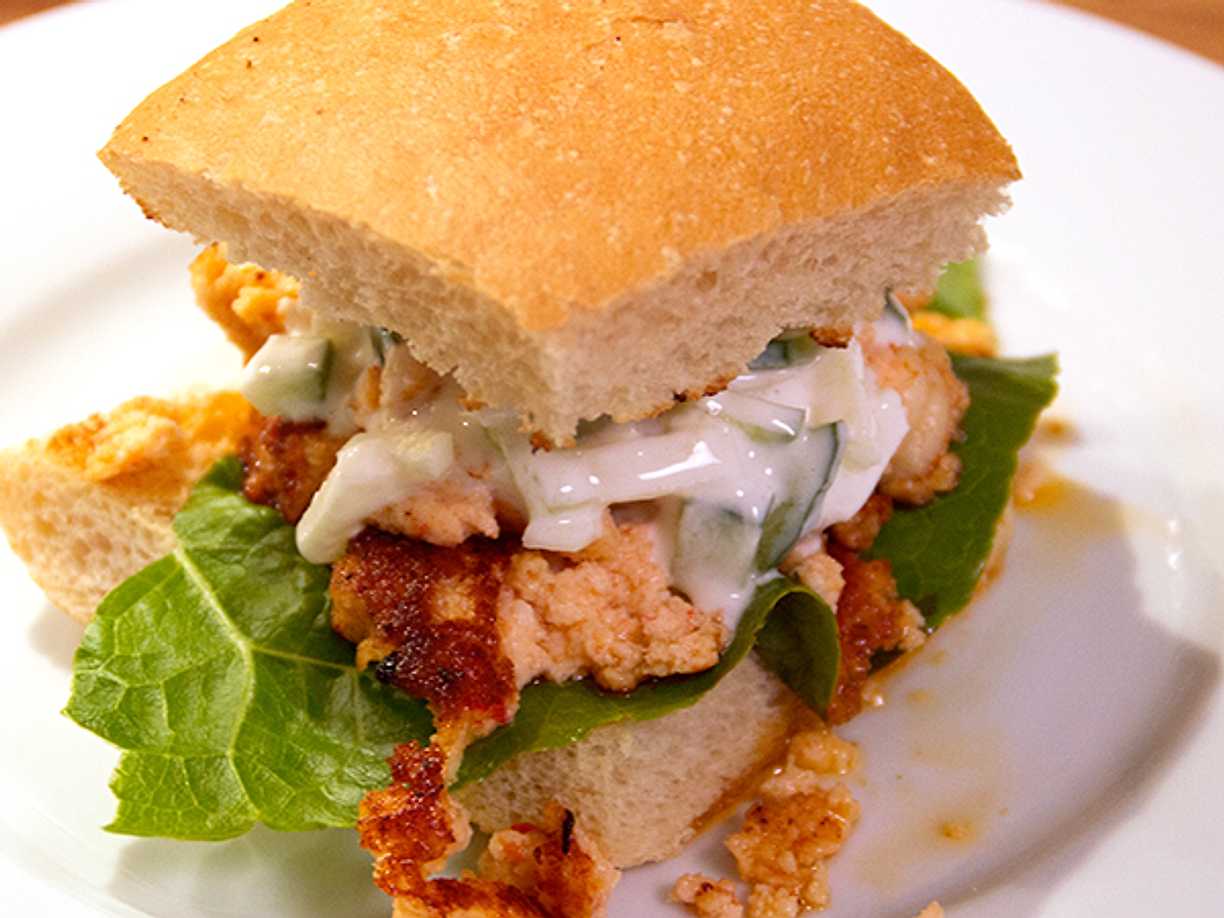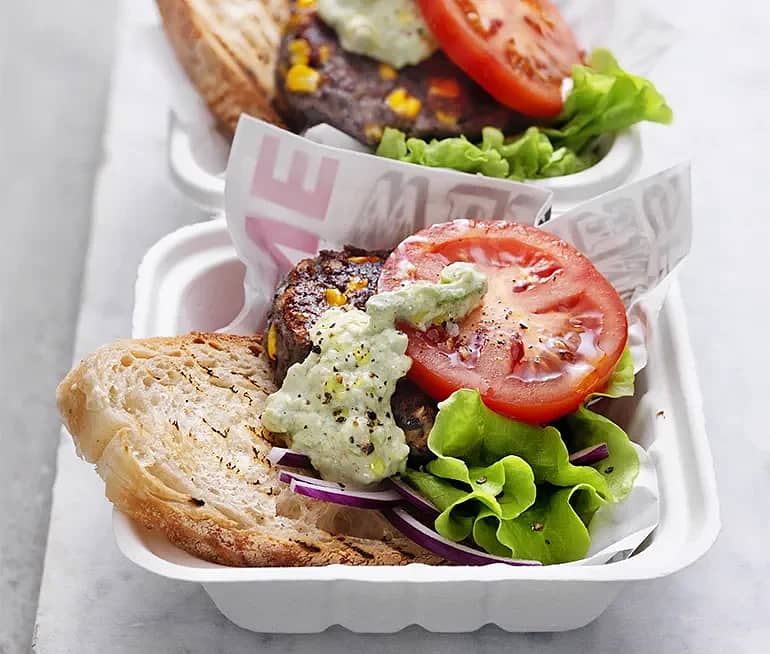 Kycklingburgare med avokadoyoghurt och grillad mango