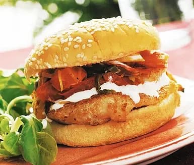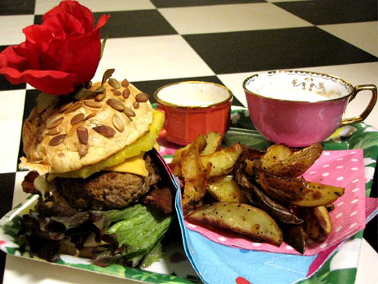 Hönsburgare med cashewmajonnäs och sötpotatispommes