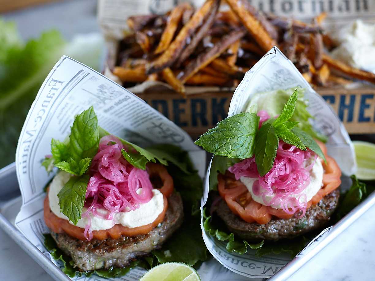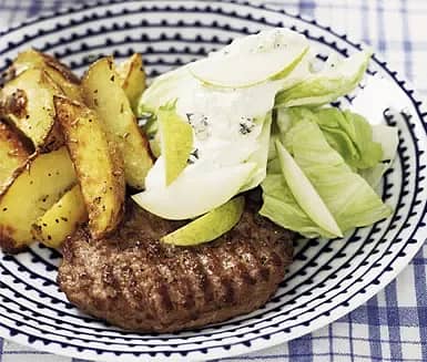 Ajvarburgare med klyftpotatis och morotstzatziki