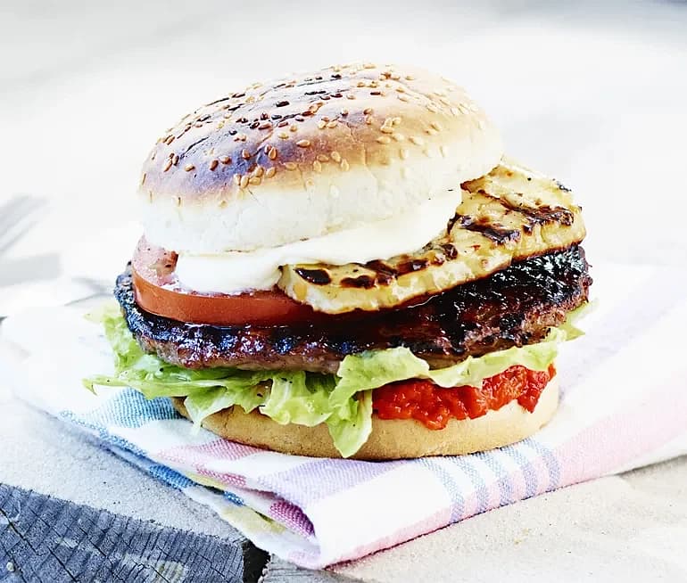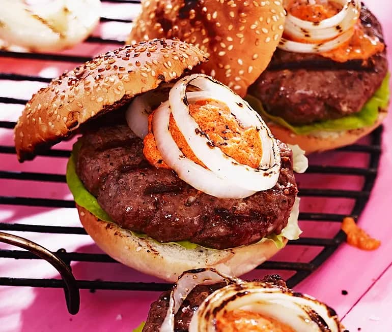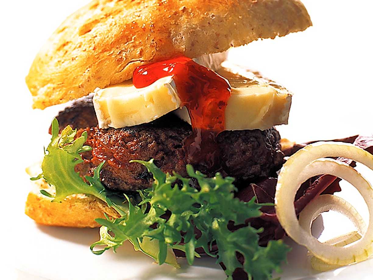Cheeseburgare med brie, pestokräm och grillad sparris