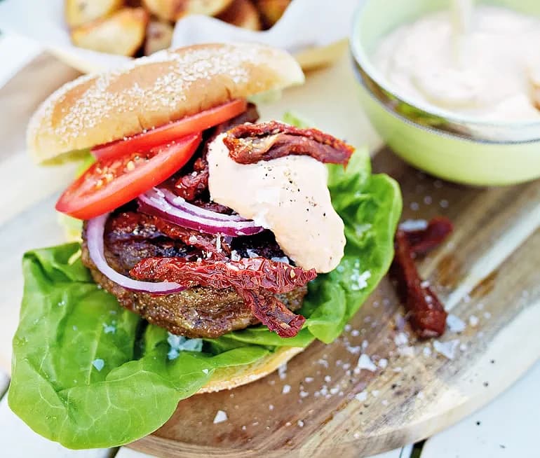 Vegoburgare med sötpotatispommes och tryffelmajo