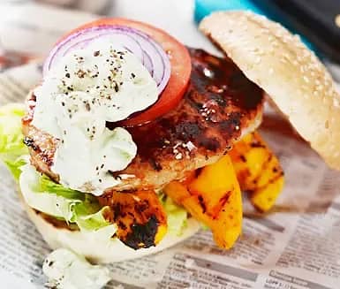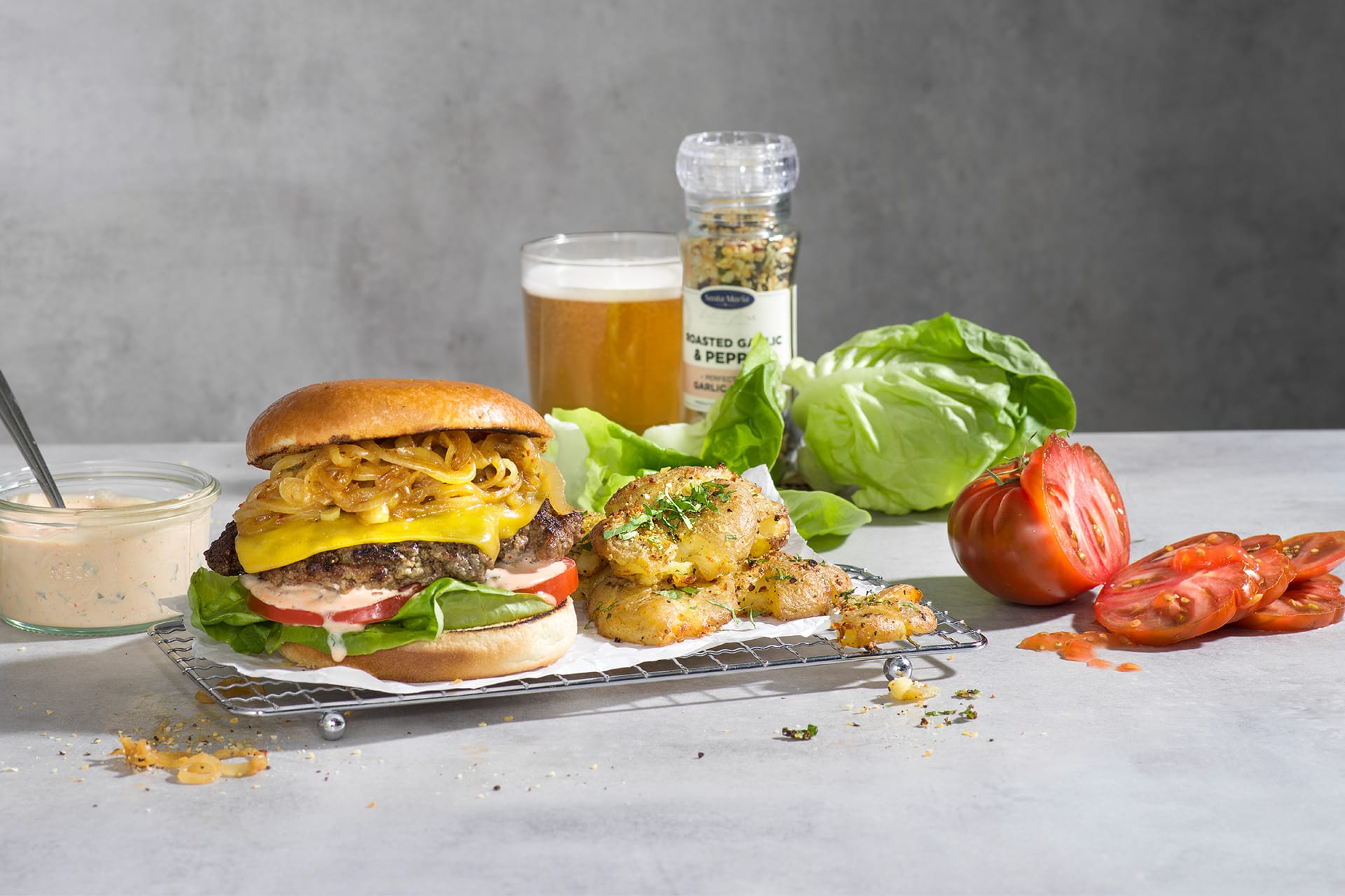 Grillade hamburgare med cheddarost, bacon och sötpotatispommes