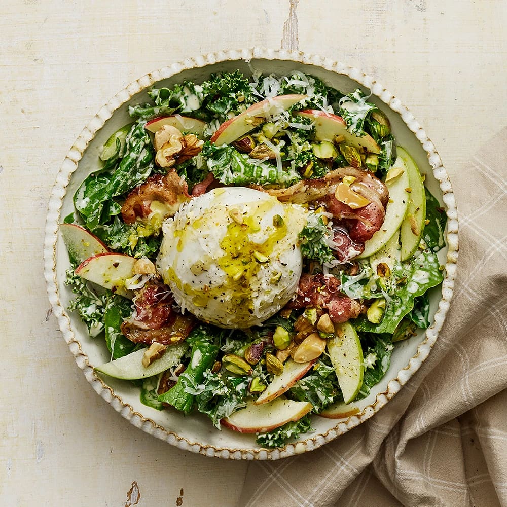 Caesarsallad med burrata, bacon och äpple