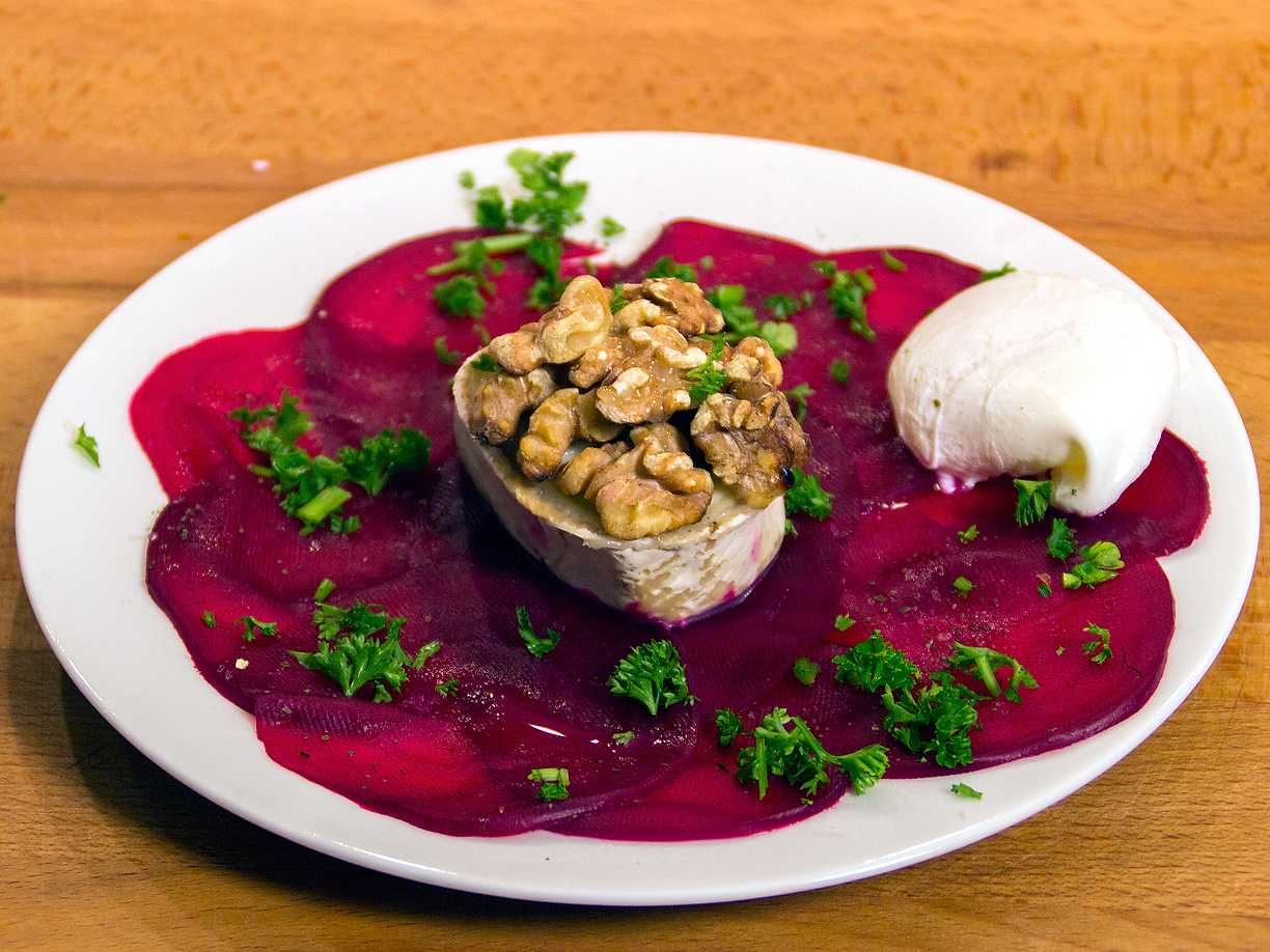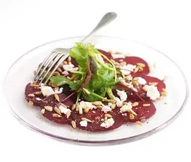 Carpaccio på tre sorters beta med sallad maché och honung champagne