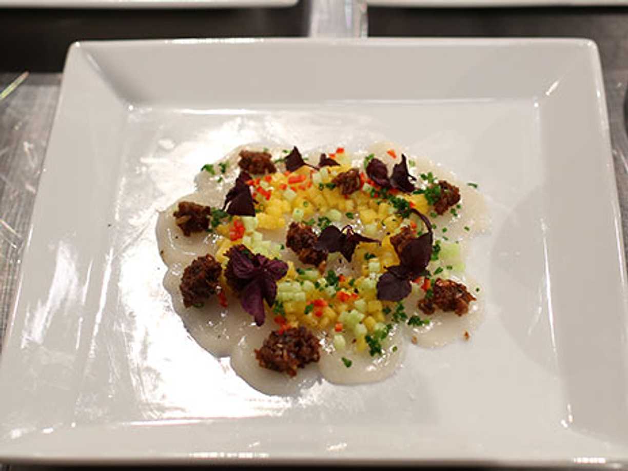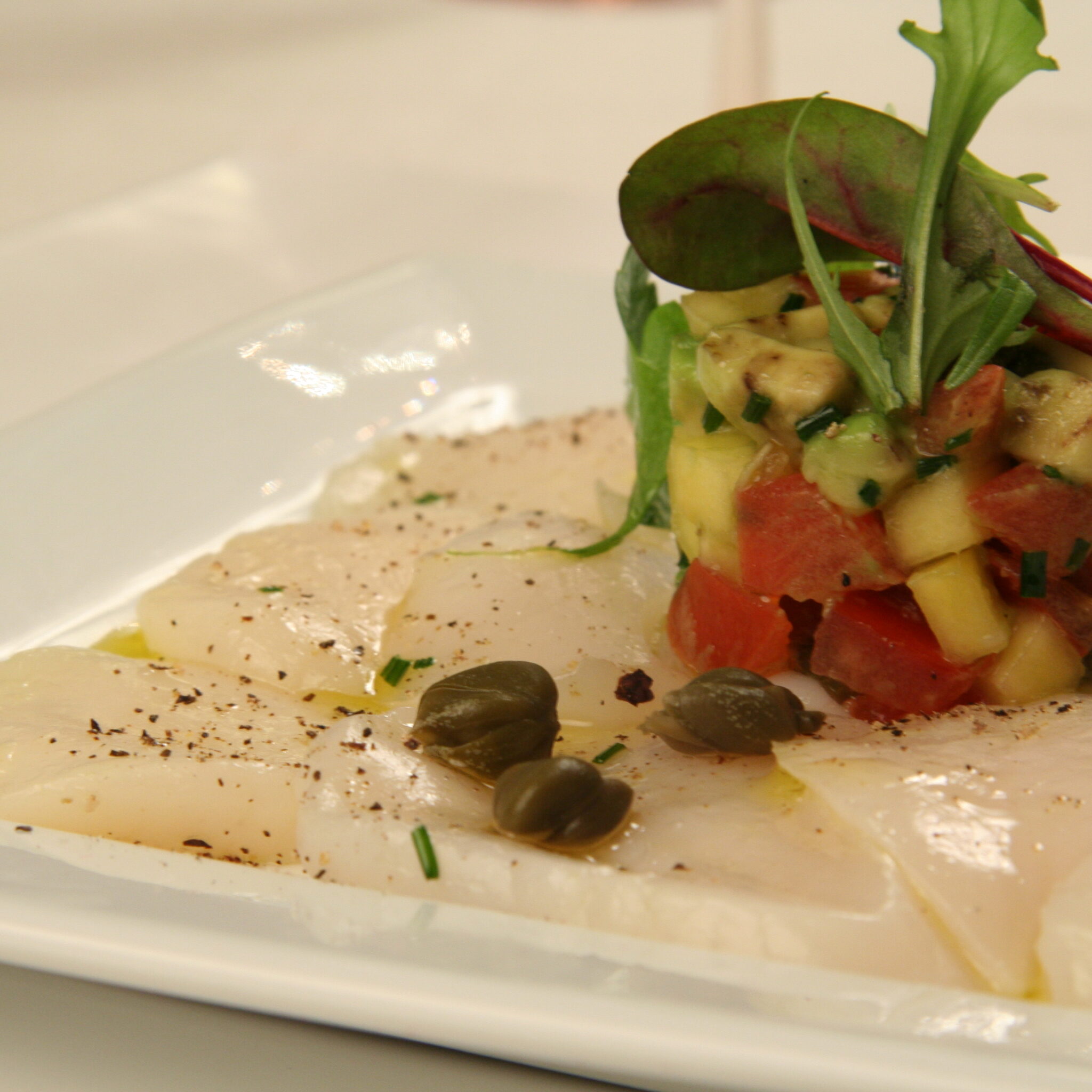 Carpaccio på pilgrimsmussla med avokado och mangosallad