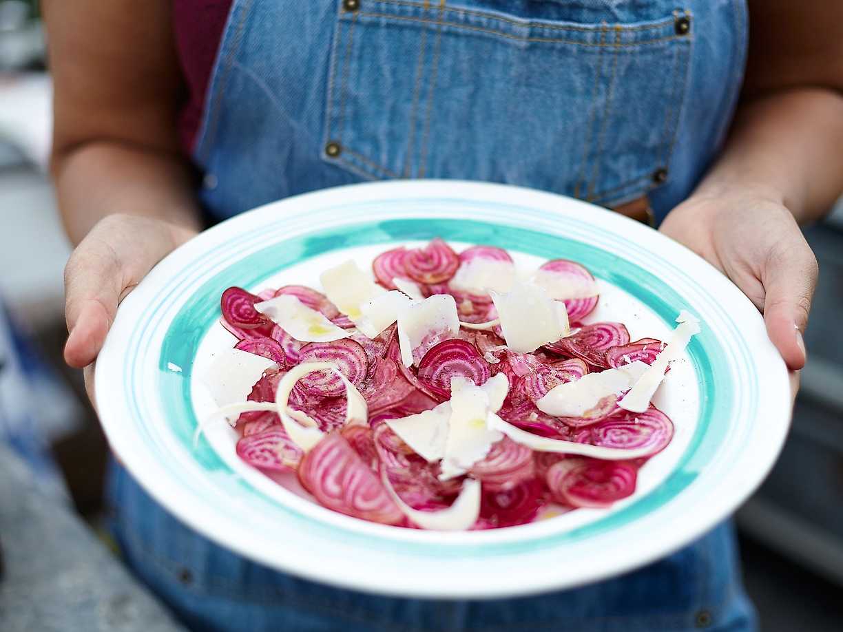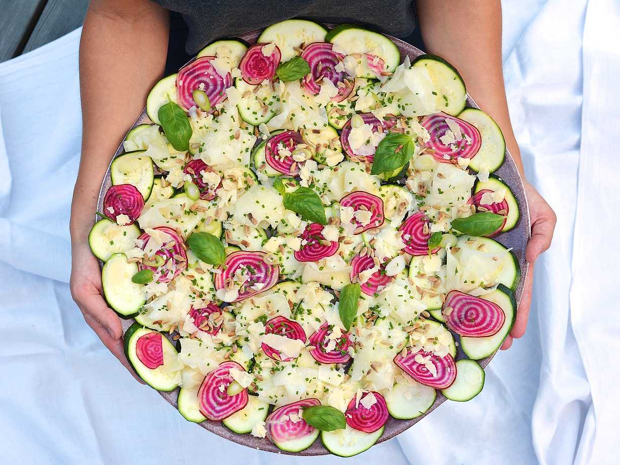 Carpaccio på polkabetor och kålrabbi med gruyère, örter och solrosfrön