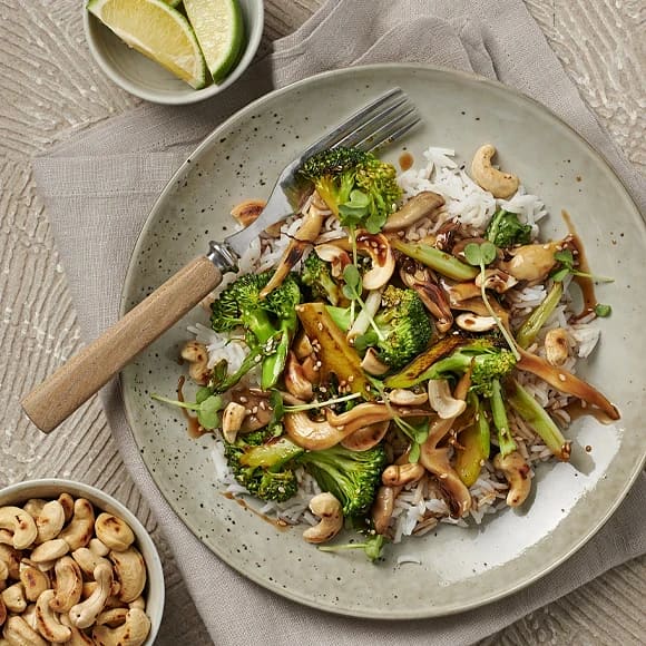 Wokad shiitake, bok choy, salladslök och cashewnötter