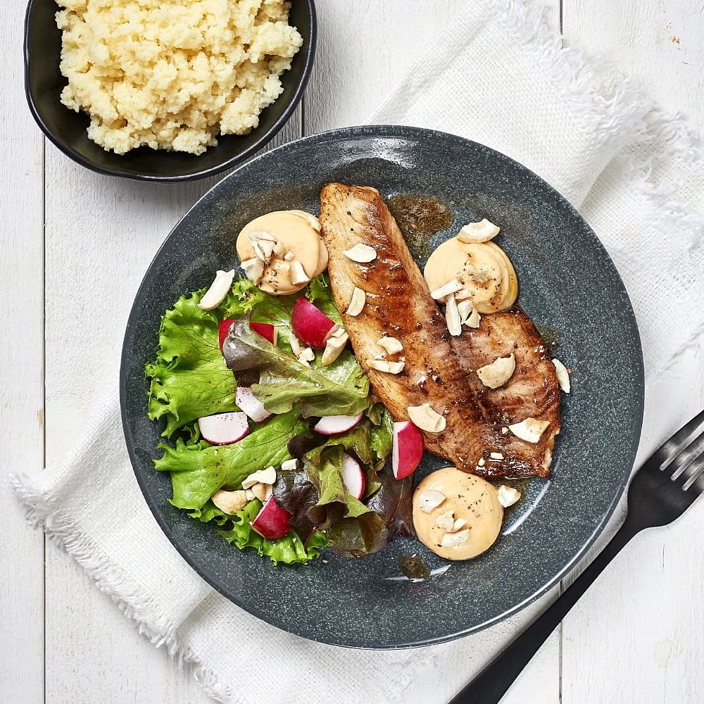 Ugnsbakad lax med cashewnötter och citronbräserad potatis