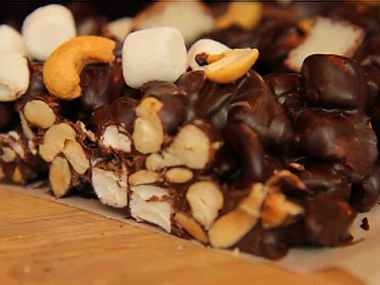 Kladdkaka med popcorn, cashewnötter och kolasås