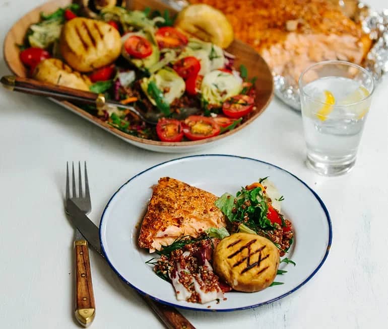Halstrad laxrygg med rostade svartrötter, bacon, champinjoner och varm rödvinsvinägrett