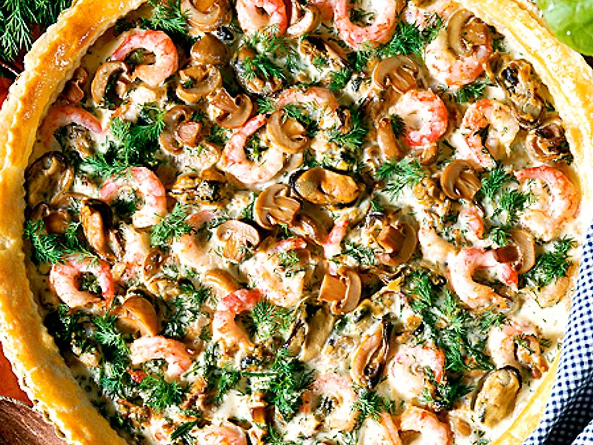 Paj med kräftstjärtar, champinjoner, tomat och kronärtskocka