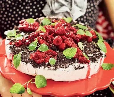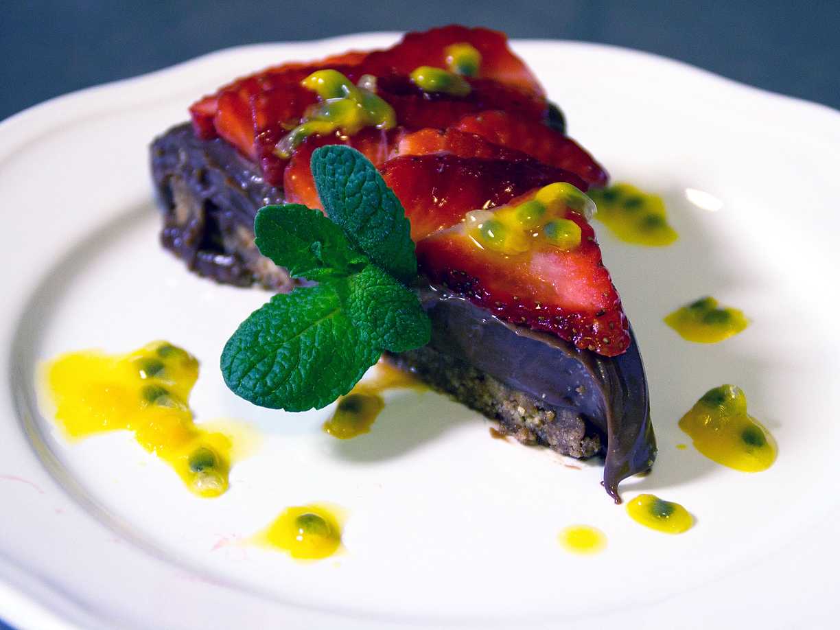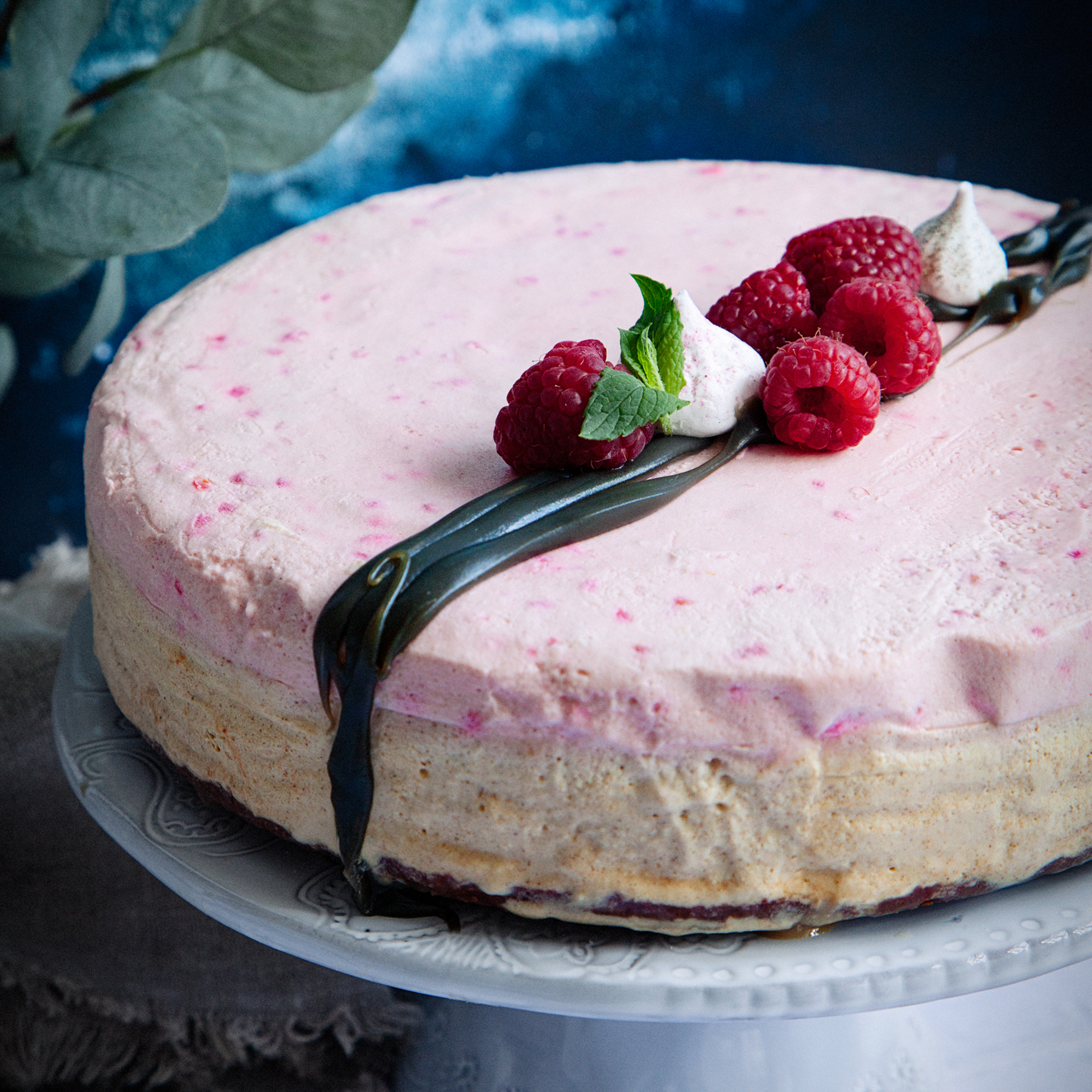 Italiensk cheesecake med kolasås och hallon