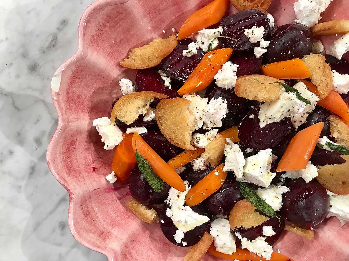 Morötter, rödbetor och chèvre med salviakrutonger