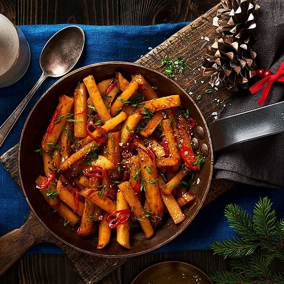 Karamelliserad kålrot med apelsin, gräslök och chili