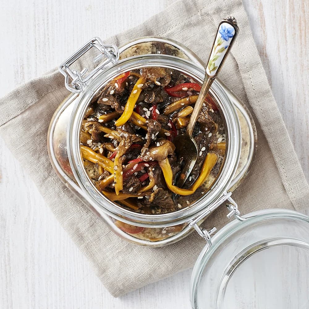 Stekt ryggbiff med chili och vitlöksstekt svamp samt rödvinssås