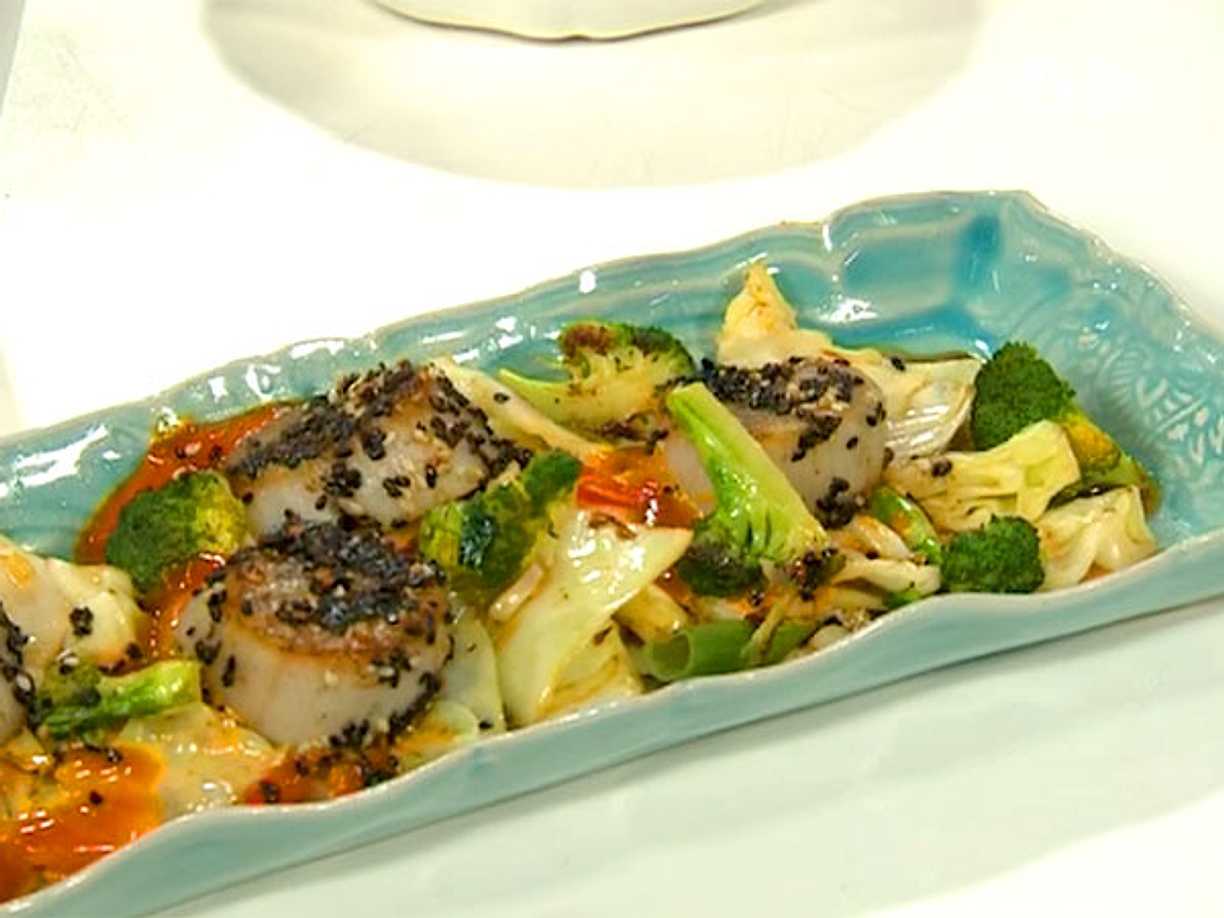 Sesamstekta pilgrimsmusslor med ingefärsbroccoli och chili
