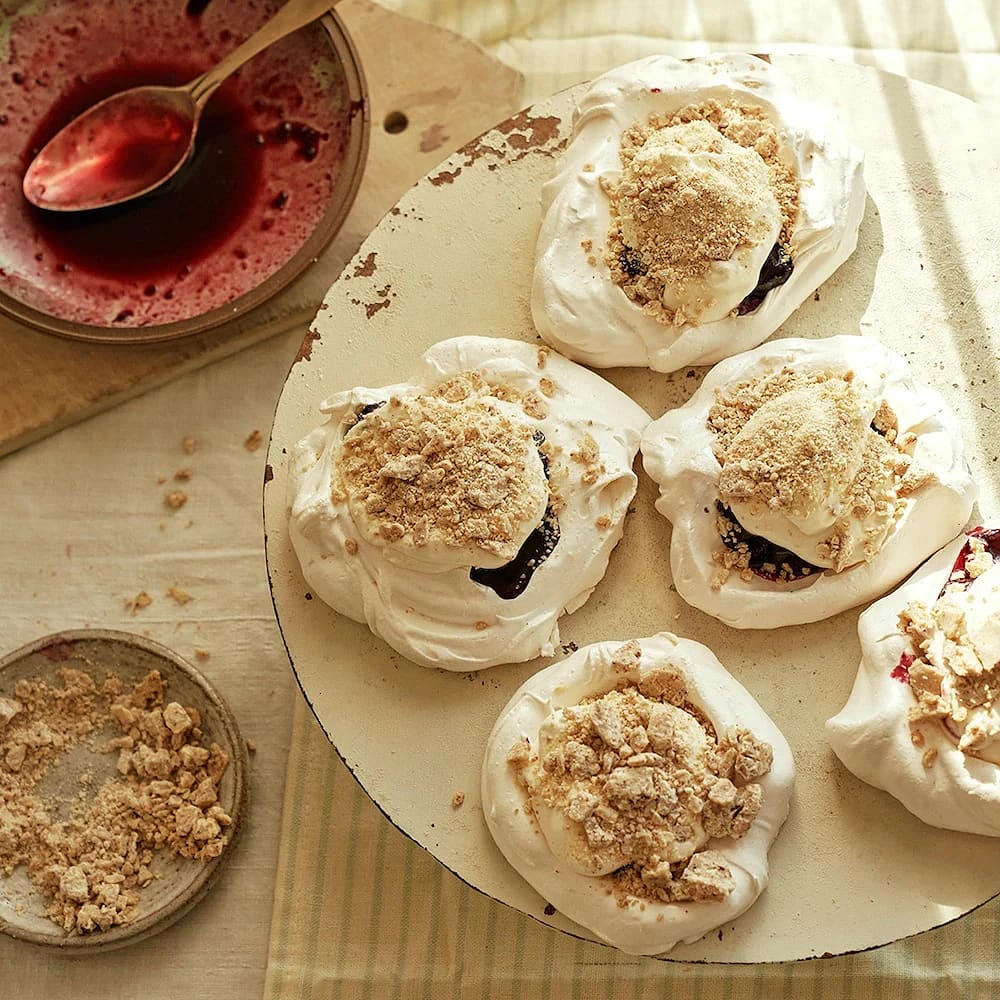 Pavlova med körsbär och rostad vit choklad