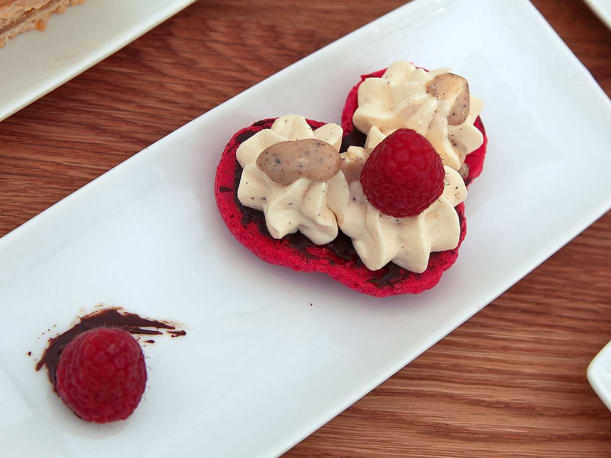 Macaronbakelse med vaniljkräm, choklad och hallon